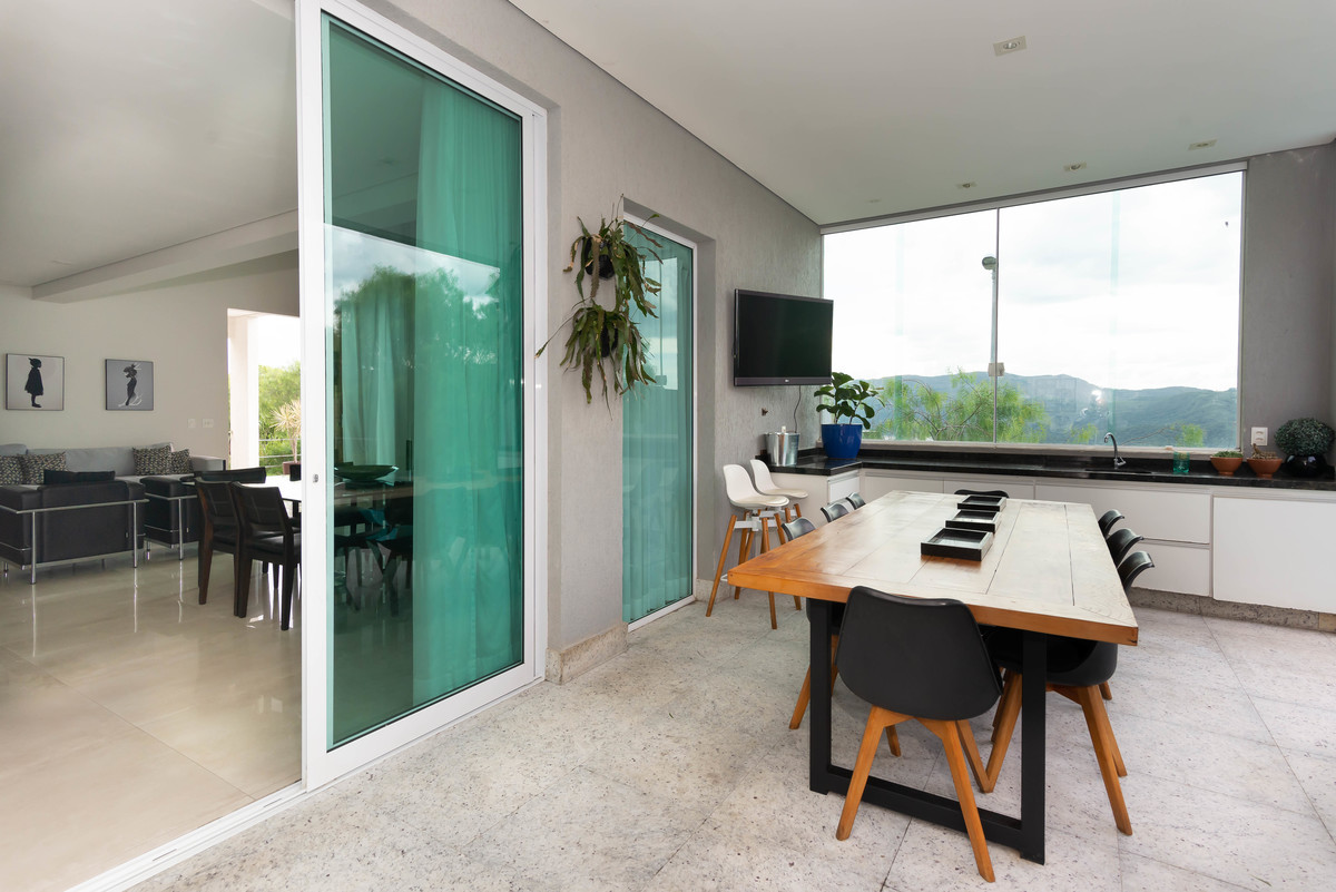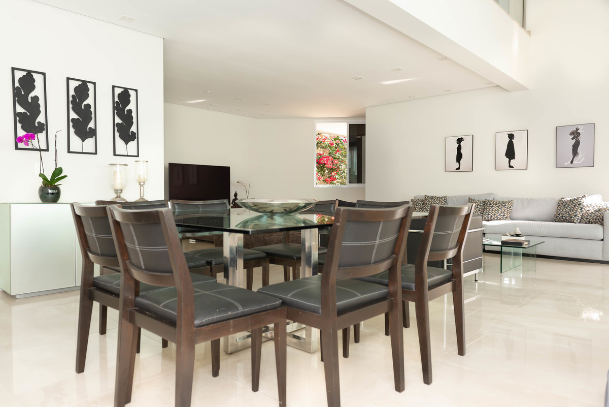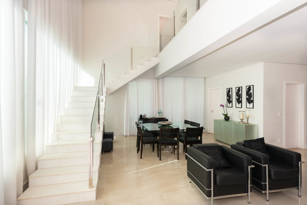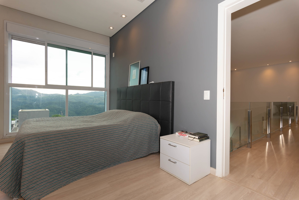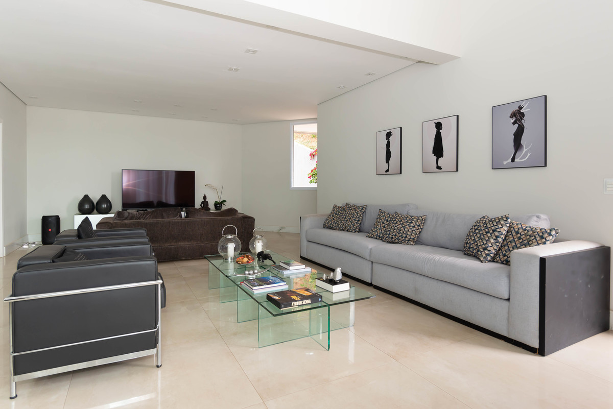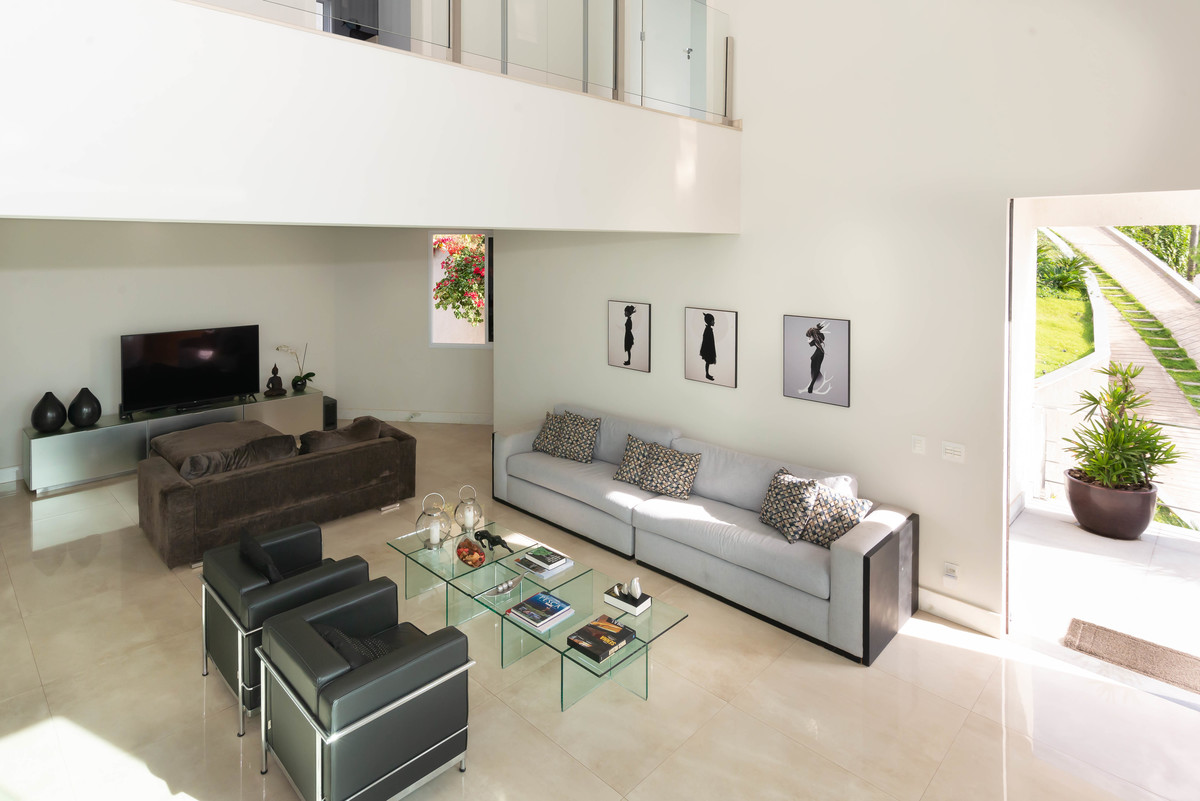A sala de estar é um espaço deslumbrante, com teto duplo e grandes janelas panorâmicas que inundam o ambiente de luz natural, permitindo uma conexão perfeita entre o interior e o exterior. Os acabamentos luxuosos, como pisos de madeira nobre e móveis elegantes, conferem um ambiente acolhedor e refinado.