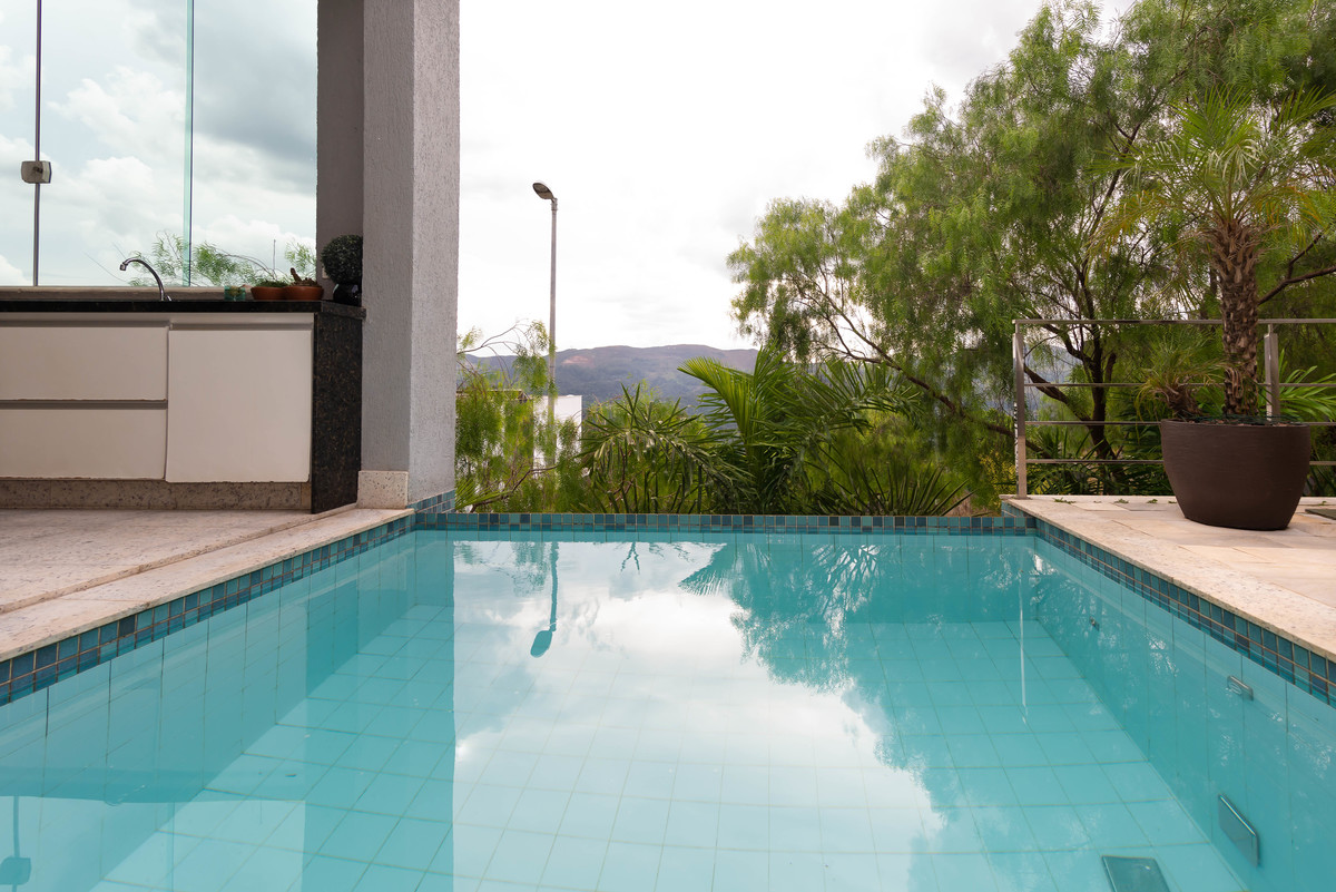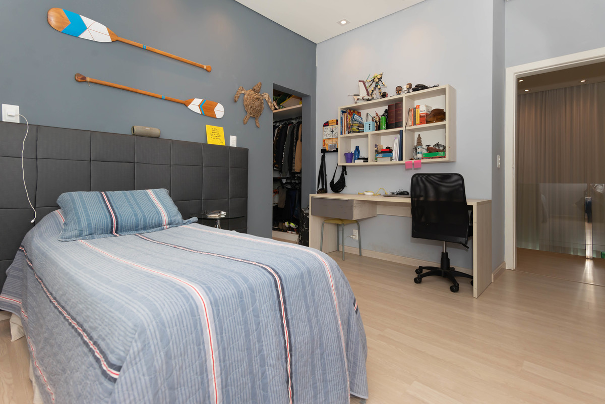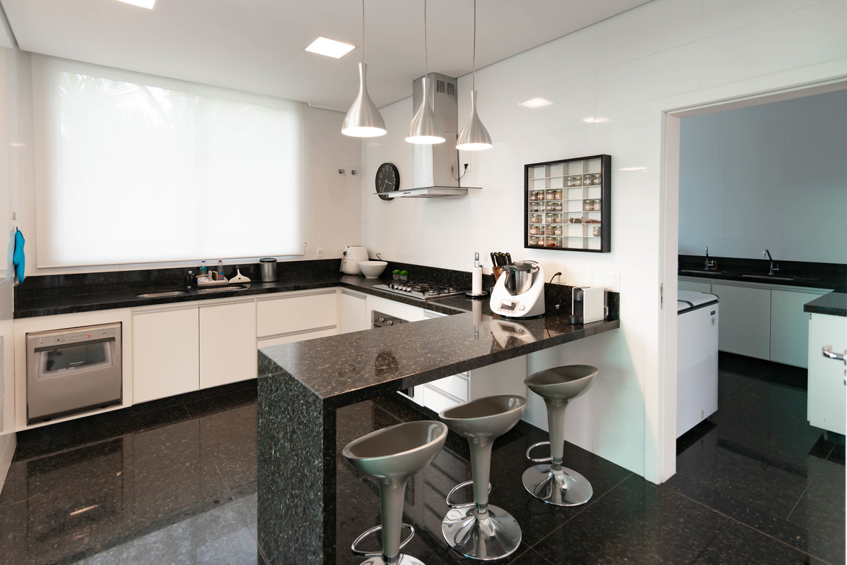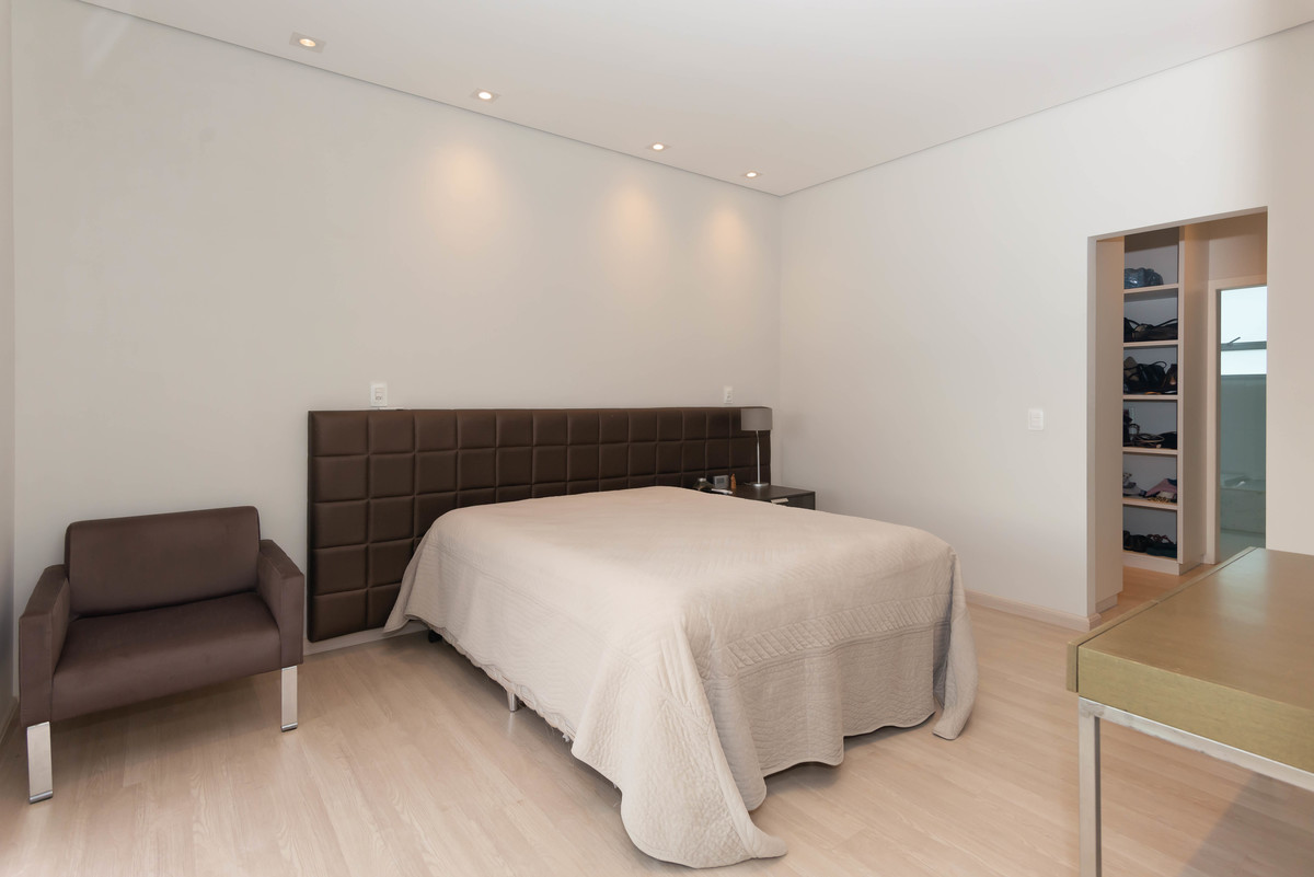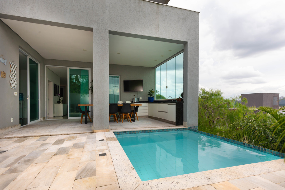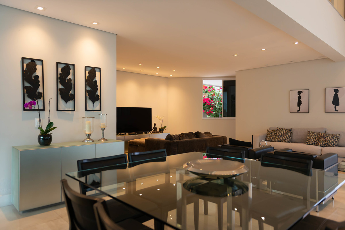 A sala de estar é um espaço deslumbrante, com teto duplo e grandes janelas panorâmicas que inundam o ambiente de luz natural, permitindo uma conexão perfeita entre o interior e o exterior. Os acabamentos luxuosos, como pisos de madeira nobre e móveis elegantes, conferem um ambiente acolhedor e refinado.