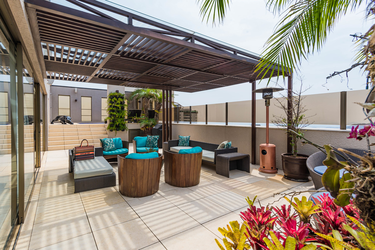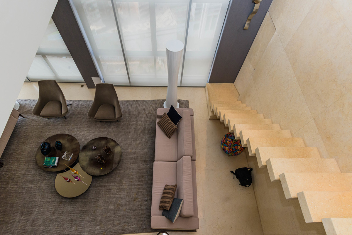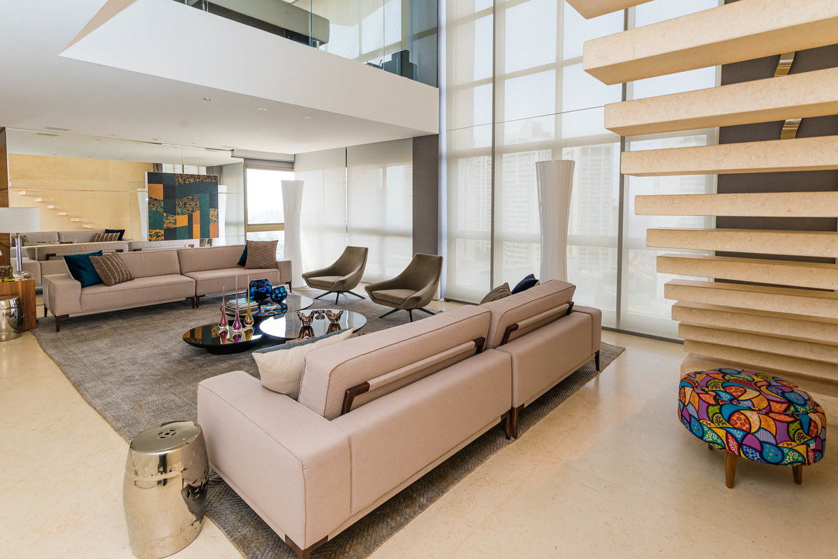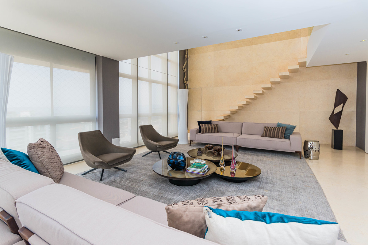 Ao entrar na cobertura, você é recebido por uma espaçosa sala de estar decorada com móveis luxuosos e contemporâneos. Grandes janelas do chão ao teto proporcionam uma vista panorâmica deslumbrante das montanhas e da paisagem circundante, criando uma atmosfera serena e relaxante.